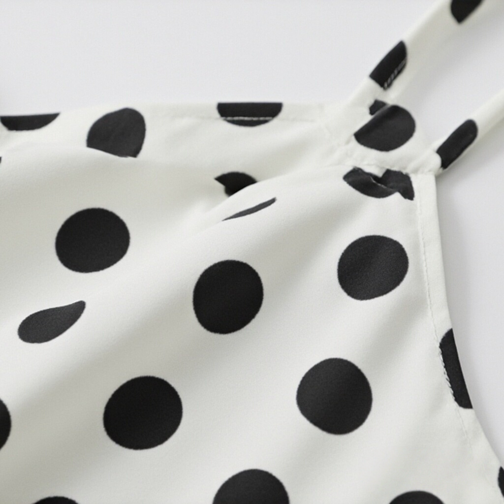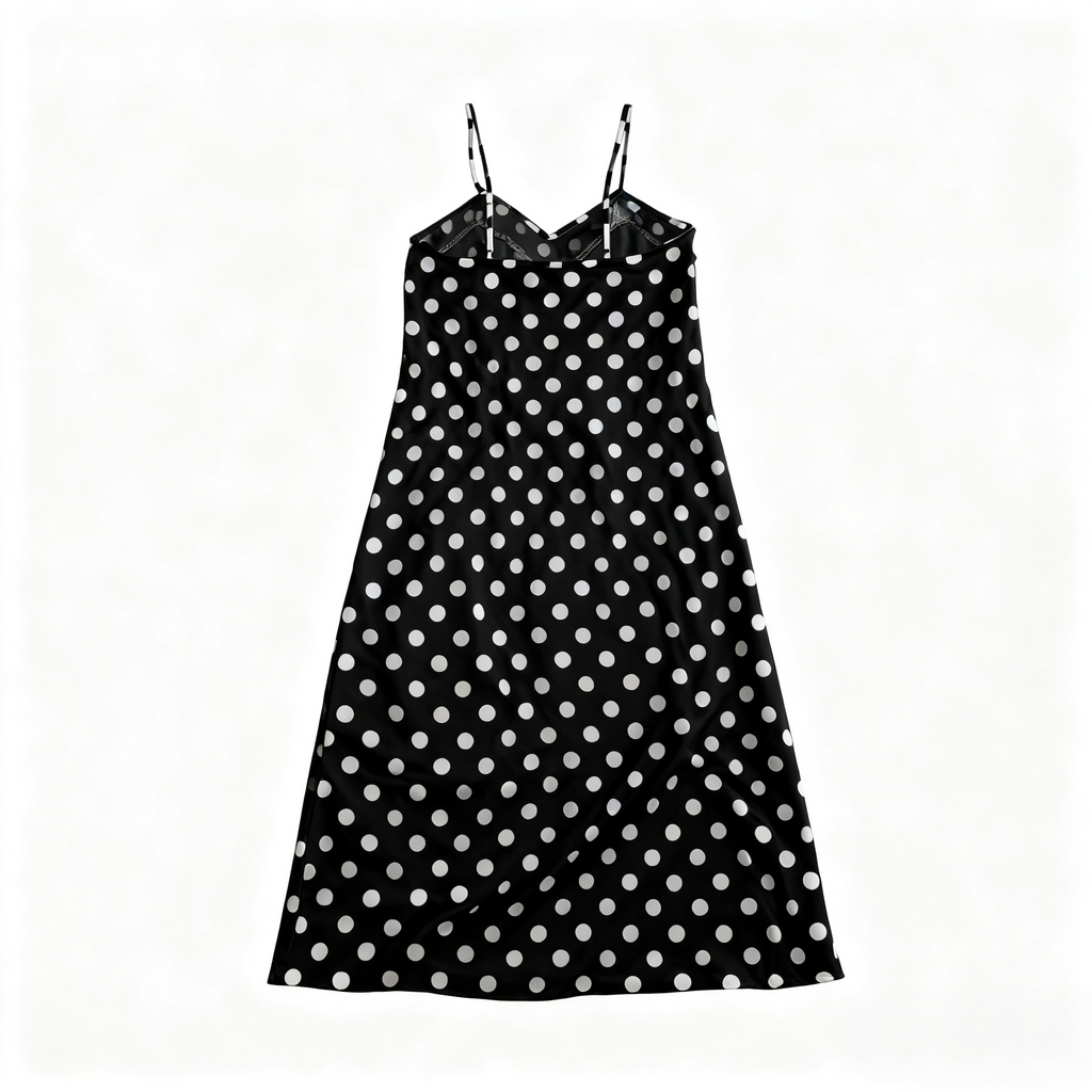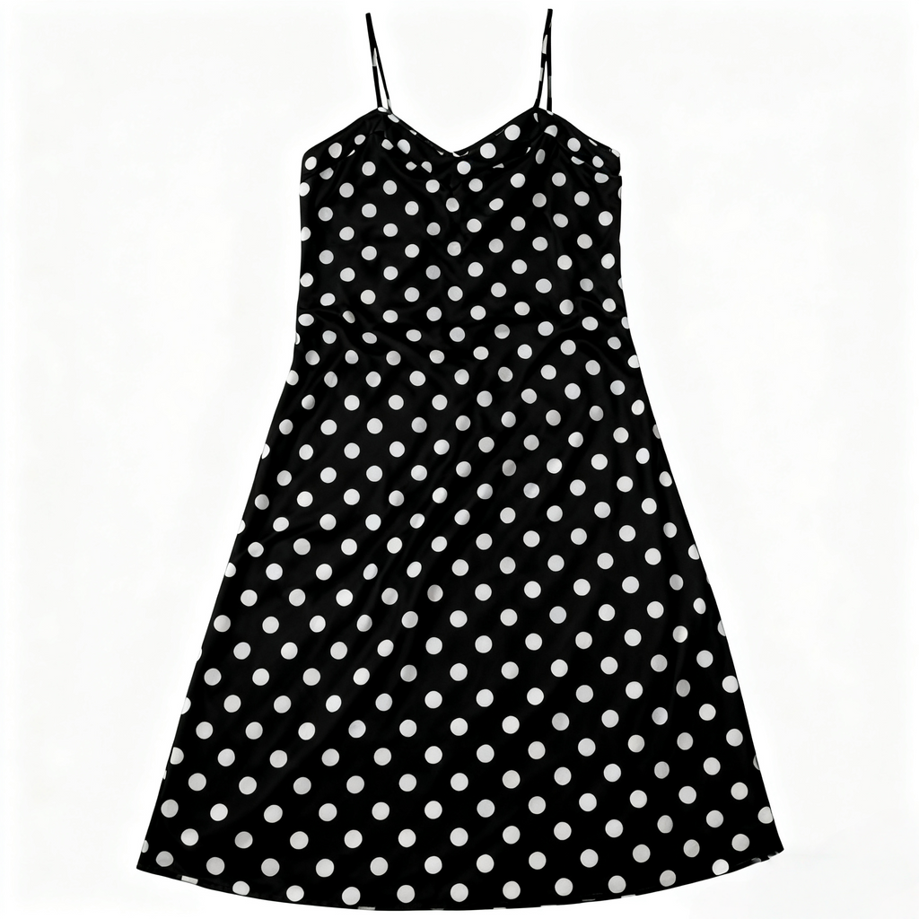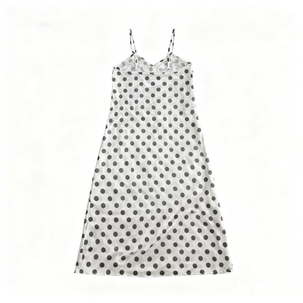 Smooth satin fabric provides a luxurious, sleek feel against the skin. Playful polka dot pattern adds vitality and fun to the simple design. Thin straps and A-line hem elegantly accentuate the neckline and body silhouette.